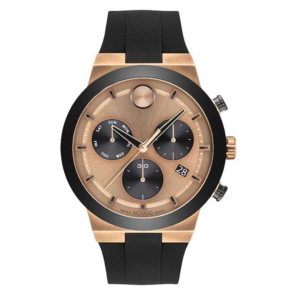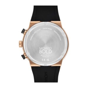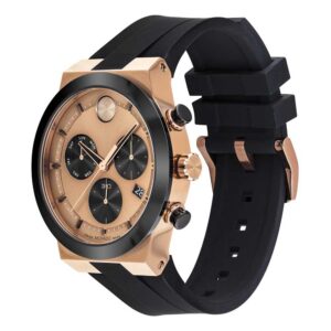 Amaze everyone around you by wearing this men’s analog watch from Movado. The rose gold chronograph dial with 3 subdial is protected by a mineral glass. Powered by a reliable Swiss quartz movement, this Movado watch is secured by a comfortable black silicone strap with a buckle closure. The dial with a sunray finish adds a touch of sophistication, while hands and hour markers ensure clear timekeeping. With the iconic Movado dot at 12 o’clock, date window at 4 o’clock this Swiss timepiece is a perfect combination of style and functionality for the active man.